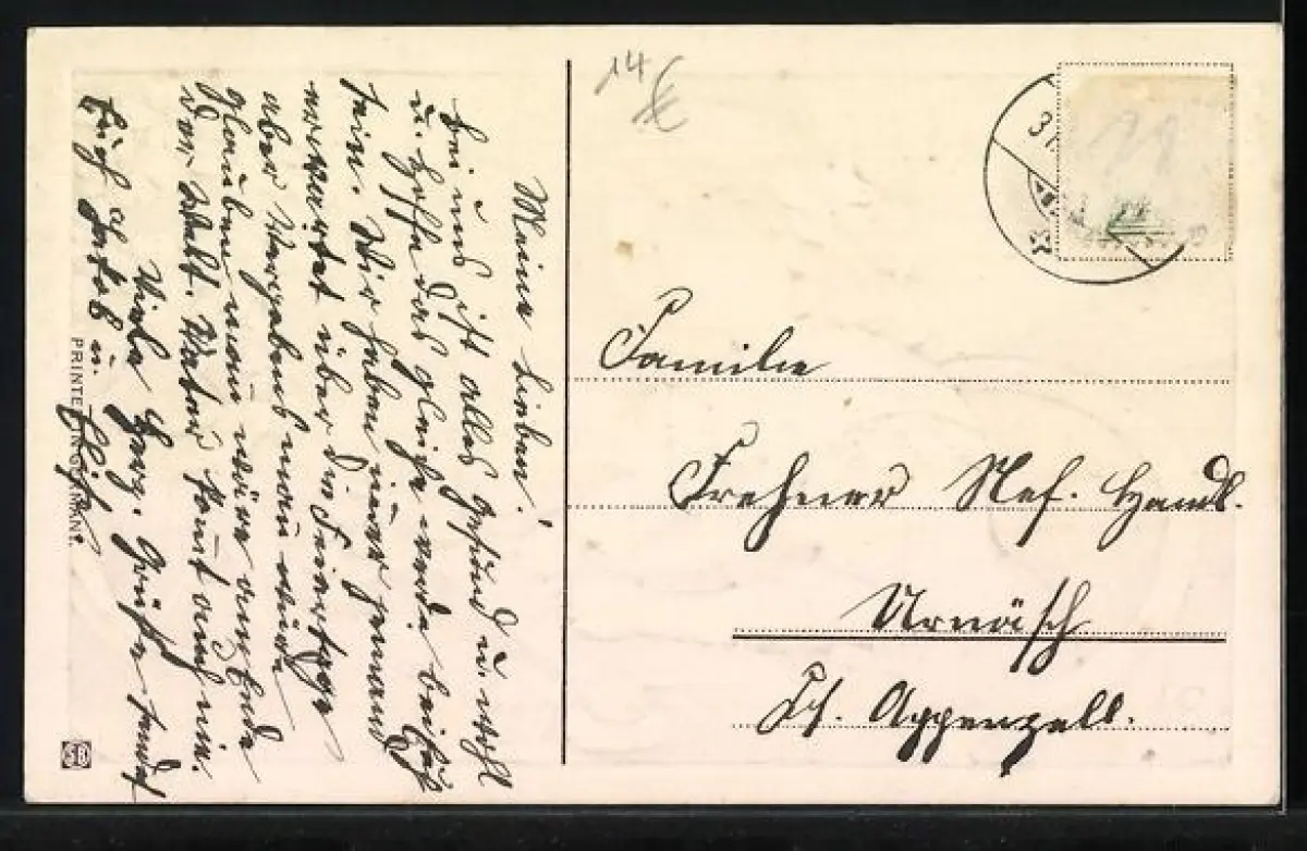 alte Ansichtskarte, gelaufen, Briefmarke entfernt, rückseitig Oberflächenschaden