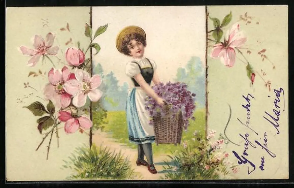 Präge-AK Mädchen trägt einen Korb voller Veilchen