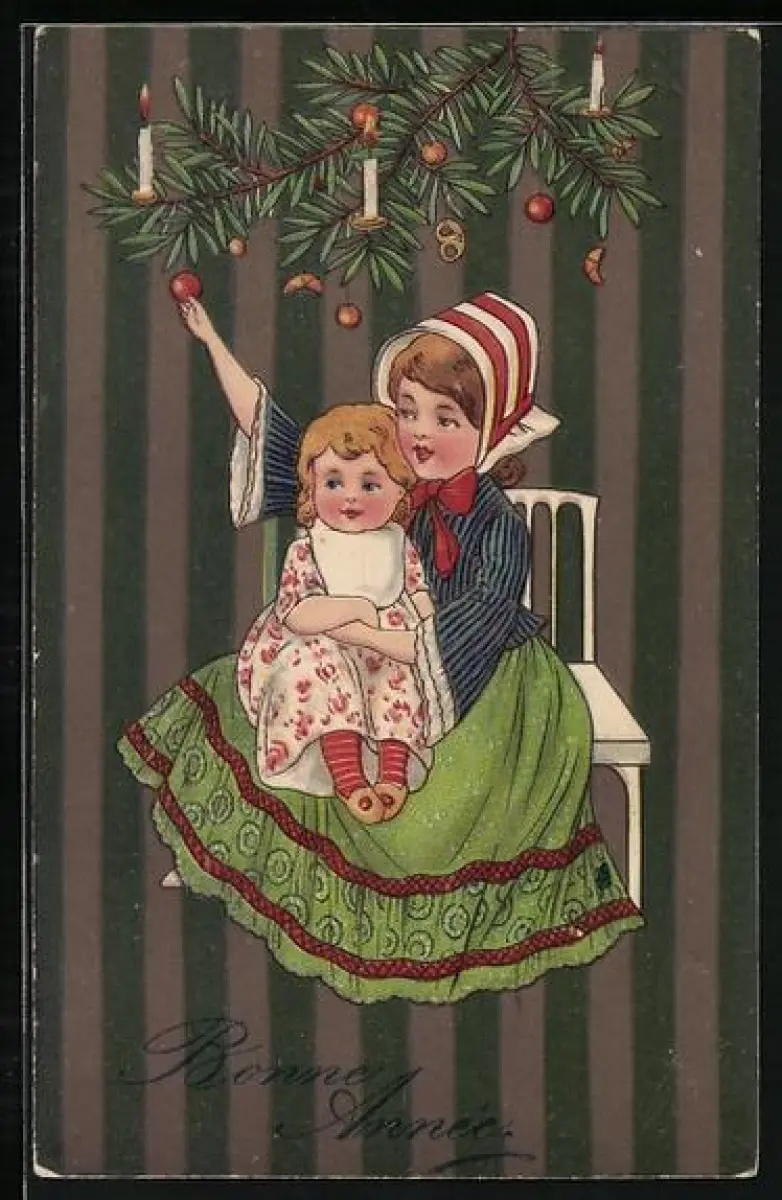 Präge-AK Mädchen untern Christbaum, Bonne Année