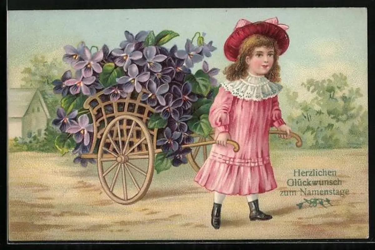 Präge-AK Mädchen zieht einen Karren mit Veilchen, Herzlichen Glückwunsch zum Namenstag
