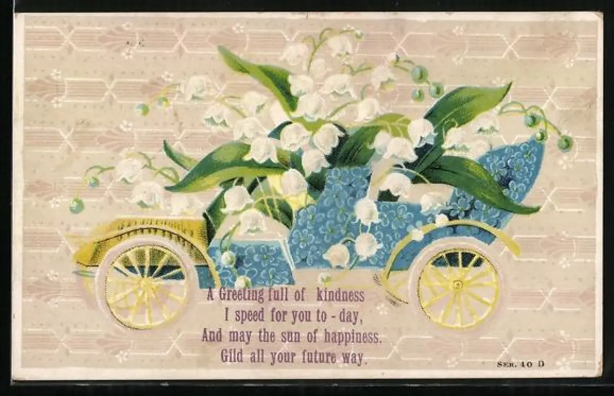 Präge-AK Maiglöckchen im Auto aus Vergissmeinnicht, Blumenbild