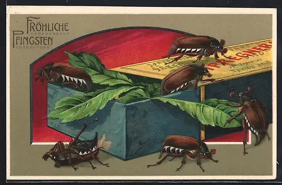 Präge-AK Maikäfer krabbeln aus einer Streichholzschachtel, Pfingstgruss
