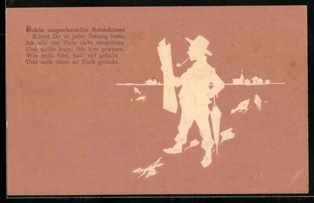 Präge-AK Mann mit Pfeife und Schirm, Schön ausgeschmückte Reiseskizzen Könnt Ihr in jeder Zeitung lesen...