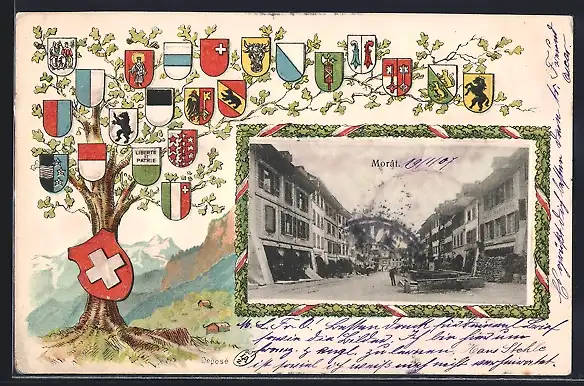 Präge-AK Morat, Strassenpartie im Ortskern, Eiche mit Wappen der Kantone