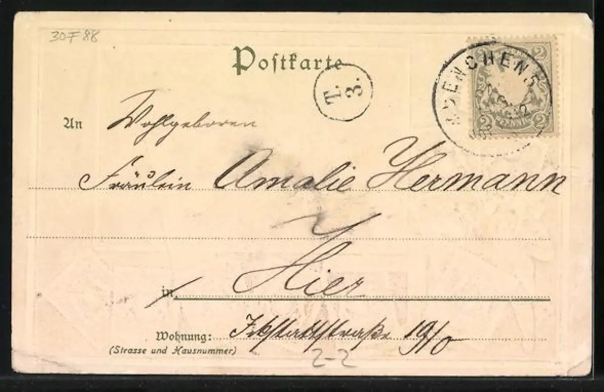 Präge-AK München, Gartentheater, Briefmarken-Passepartout mit Postbote mit Horn