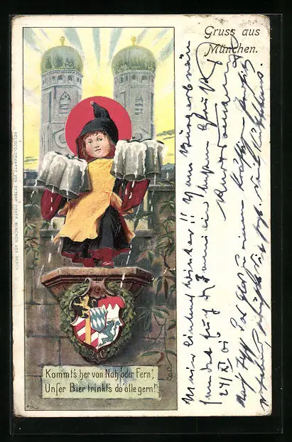 Präge-AK München, Münchner Kindl läd zum Biertrinken ein