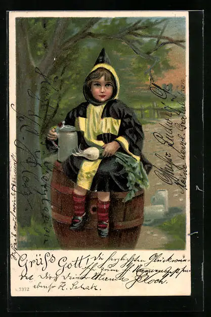 Präge-AK Münchner Kindl mit Bierkrug sitzt auf einem Fass