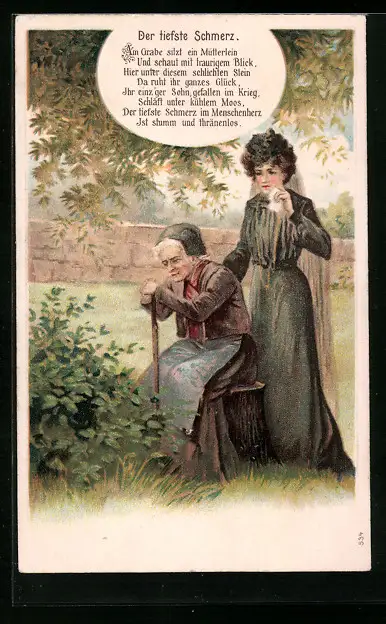 Präge-AK Mutter trauert am Grab des gefallenen Sohnes, Gedicht Der tiefste Schmerz, Tod