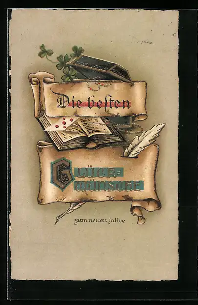 Präge-AK Neujahr, Offenes Buch mit Hufeisen, Brief und Feder