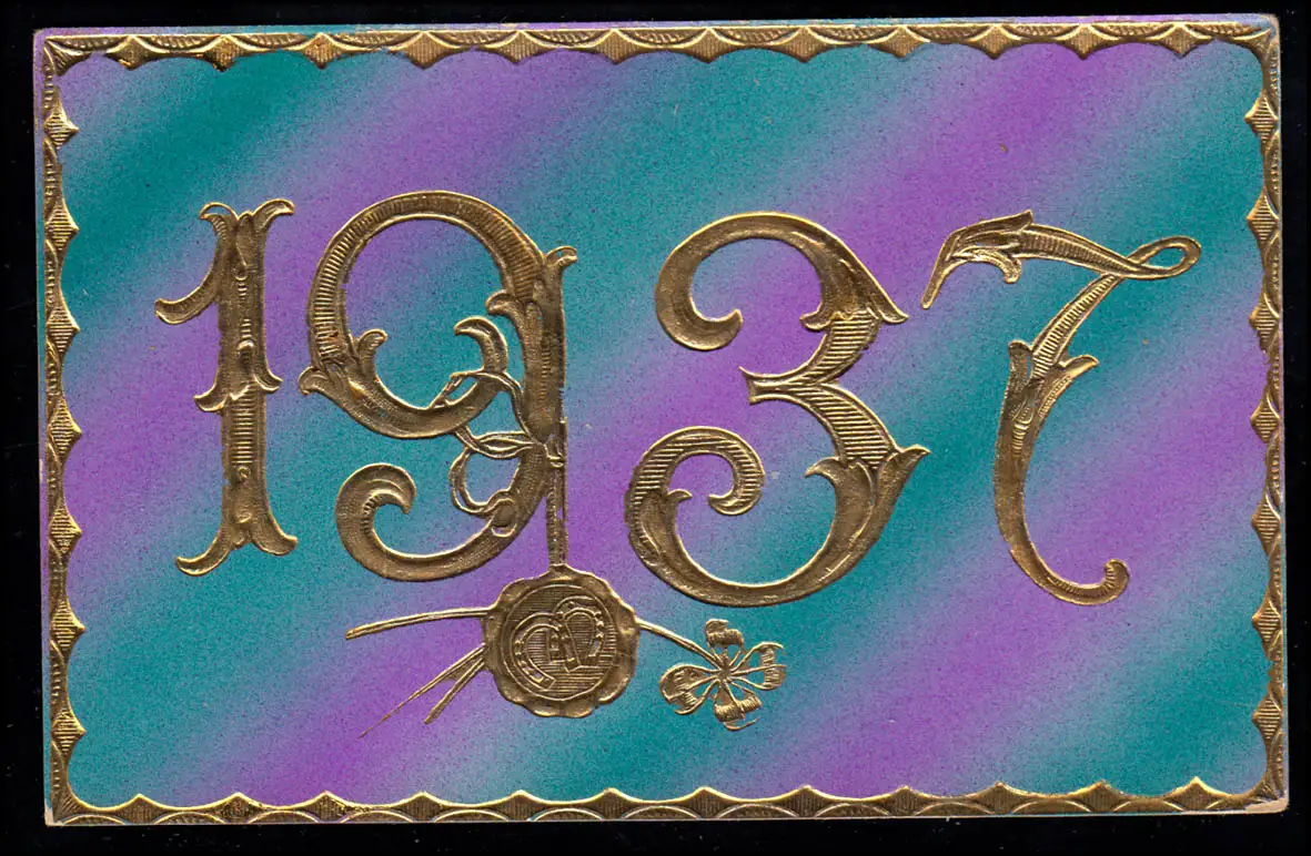 Präge-AK Neujahr: Vergoldete 1937 mit Hufeisen und Glücksklee, ungebraucht
