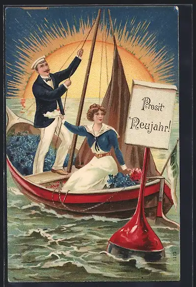 Präge-AK Neujahrgruss, Matrose und Dame im Segelboot vor Sonnenuntergang