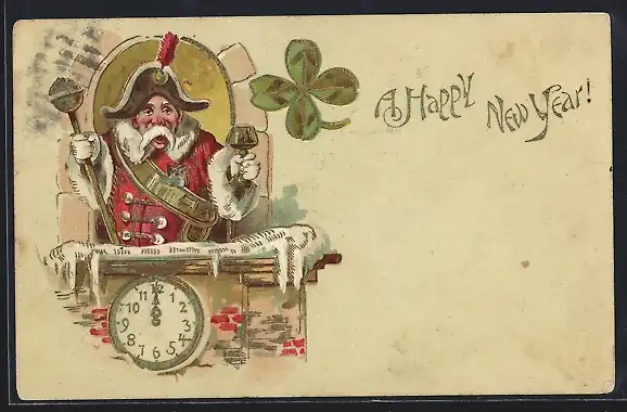 Präge-AK Neujahrgruss, Zeremonienmeister mit Uhr, Weinglas und Kleeblatt