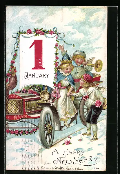 Präge-AK Neujahrsengel hilft einer königlichen Dame aus dem Auto