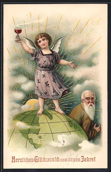 Präge-AK Neujahrsengel mit Weinglas steht auf einer Weltkugel, Neujahrsgruss