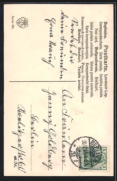 Personenbezogene Daten auf der Rückseite der Karte wurden durch blauen Textmarker unkenntlich gemacht. Die blauen Stellen sind auf die Vorderseite durchgeweicht und wirken sich negativ auf das Postkartenfoto aus