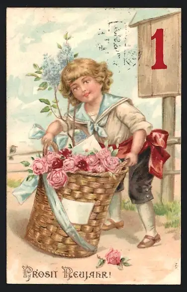 Präge-AK Neujahrsgruss, Junge mit Brief und Blumenkorb