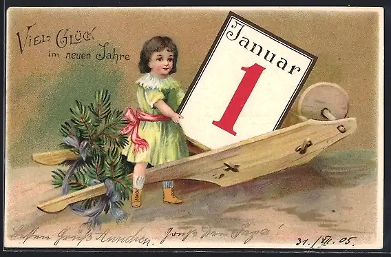 Präge-AK Neujahrsgruss, Kind läd ein Kalenderblatt auf eine Schubkarre