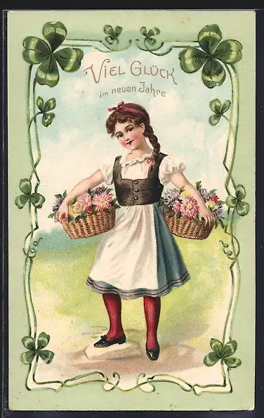 Präge-AK Neujahrsgruss, Mädchen trägt Blumenkörbe, Kleeblatt-Rahmen