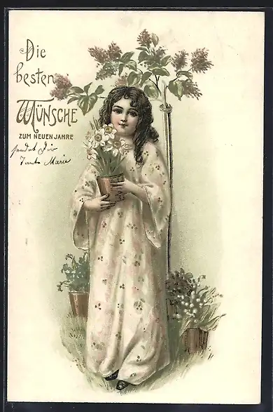 Präge-AK Neujahrsgruss, Mädchen trägt Topf mit Narzissen