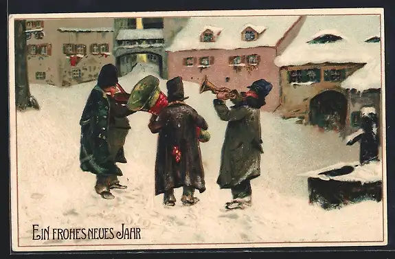 Präge-AK Neujahrsgruss, Musiker mit Trompete und Violine im Schnee