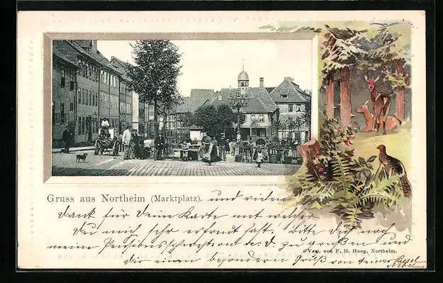 Präge-AK Northeim, Marktplatz, Rehe im Wald, Passepartout