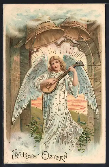 Präge-AK Osterengel spielt die Laute unter Kirchenglocken