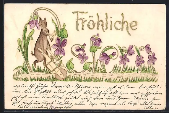 Präge-AK Osterhase schiebt einen Karren mit Eiern