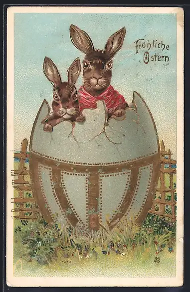 Präge-AK Osterhasen blicken aus einer Eierschale