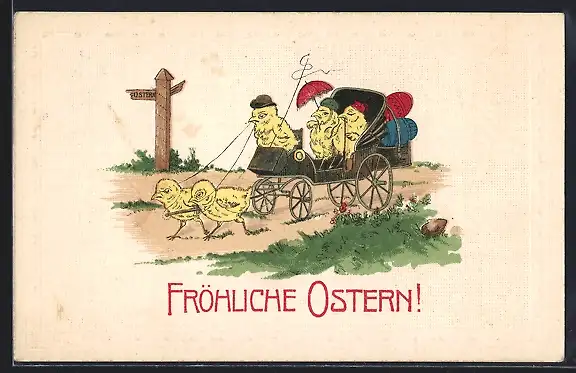 Präge-AK Osterküken fahren in einer Kutsche, Fröhliche Ostern!