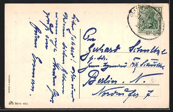 Personenbezogene Daten auf der Rückseite der Karte wurden durch blauen Textmarker unkenntlich gemacht. Die blauen Stellen sind auf die Vorderseite durchgeweicht und wirken sich negativ auf das Postkartenfoto aus