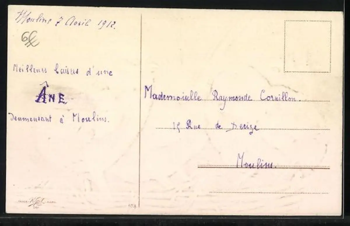 Personenbezogene Daten auf der Rückseite der Karte wurden durch blauen Textmarker unkenntlich gemacht. Die blauen Stellen sind auf die Vorderseite durchgeweicht und wirken sich negativ auf das Postkartenfoto aus