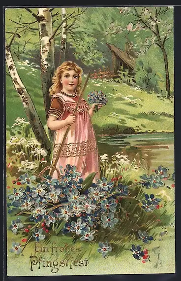 Präge-AK Pfingstgruss, Mädchen pflückt Vergissmeinnicht am Seeufer