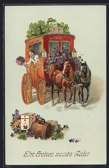 Präge-AK Postkutsche mit Kleeblättern, Neujahrsgruss