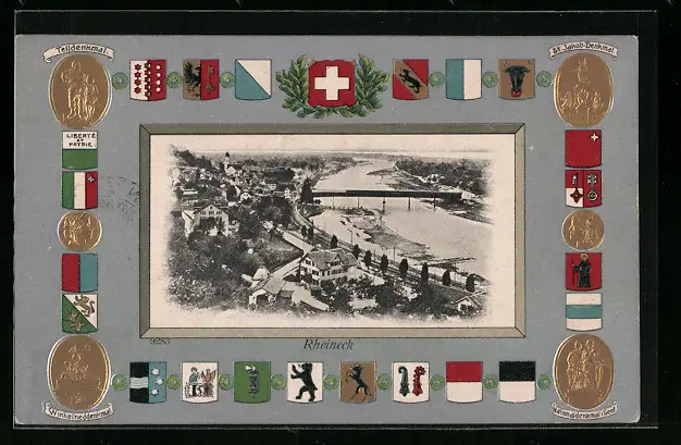 Präge-AK Rheineck, Teilansicht mit Brücke aus der Vogelschau, Wapen und Denkmäler der Schweiz