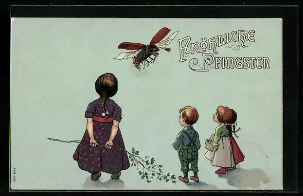 Präge-AK Riesiger Maikäfer mit kleinen Beobachtern, Pfingstgruss