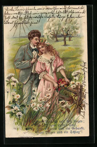 Präge-AK Romantisches Beisammensein eines Liebespaares im Garten