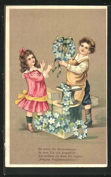 Präge-AK Schmied überreicht einem Mädchen einen Blumenkranz