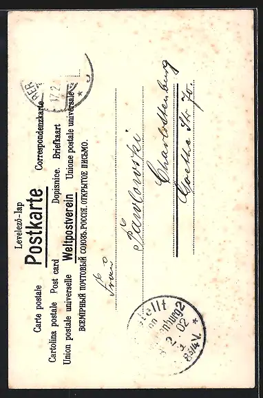 alte Ansichtskarte, gelaufen 1902, Briefmarke entfernt, rückseitig Oberflächenschaden, guter Zustand