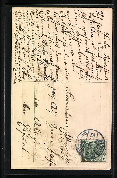 Personenbezogene Daten auf der Rückseite der Karte wurden durch blauen Textmarker unkenntlich gemacht. Die blauen Stellen sind auf die Vorderseite durchgeweicht und wirken sich negativ auf das Postkartenfoto aus