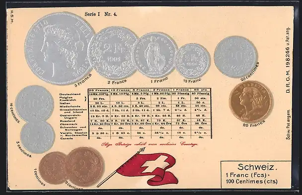 Präge-AK Schweiz, Münz-Geld, Währungsumrechnungstabelle und Nationalflagge