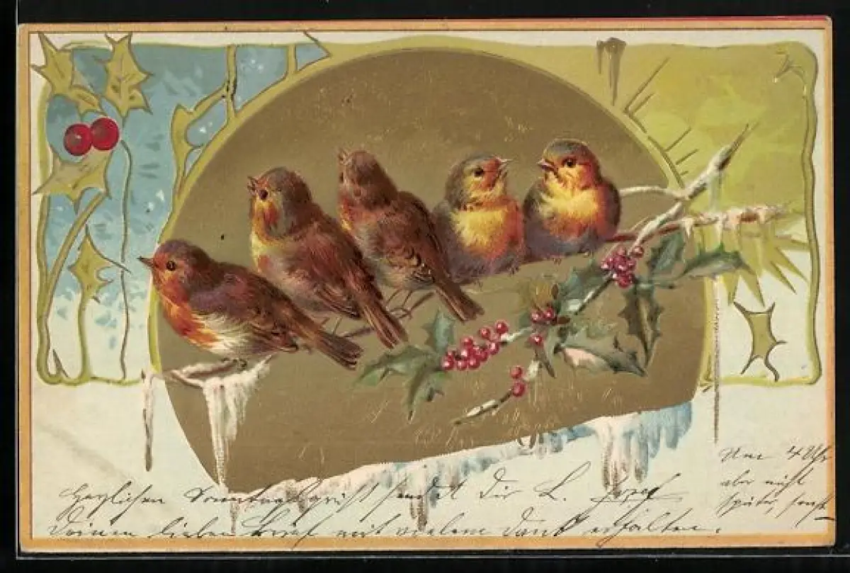 Präge-AK Singvögel auf einem Zweig, Stechpalme