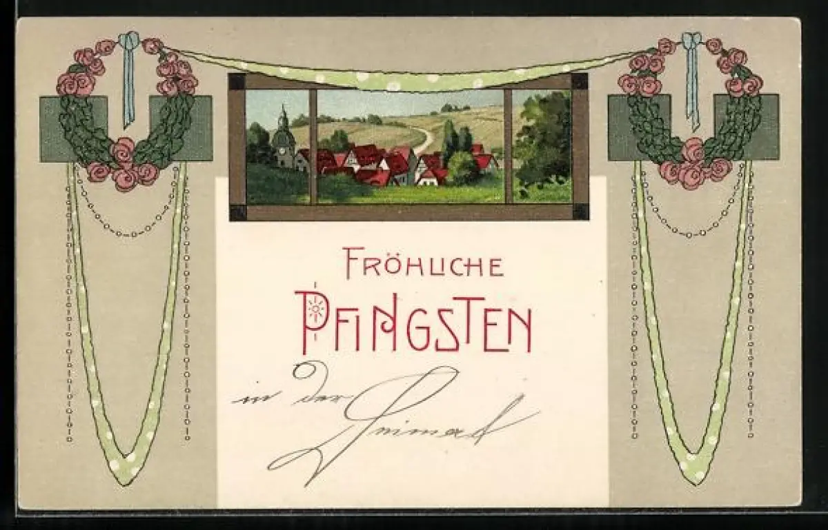 Präge-AK Sommerliche Landschaft im Biedermeierstil, Pfingstgruss
