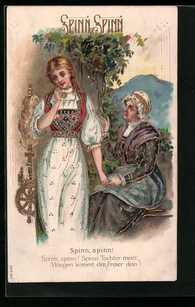 Präge-AK Spinn, spinn!..., Alte und junge Frau am Spinnrad