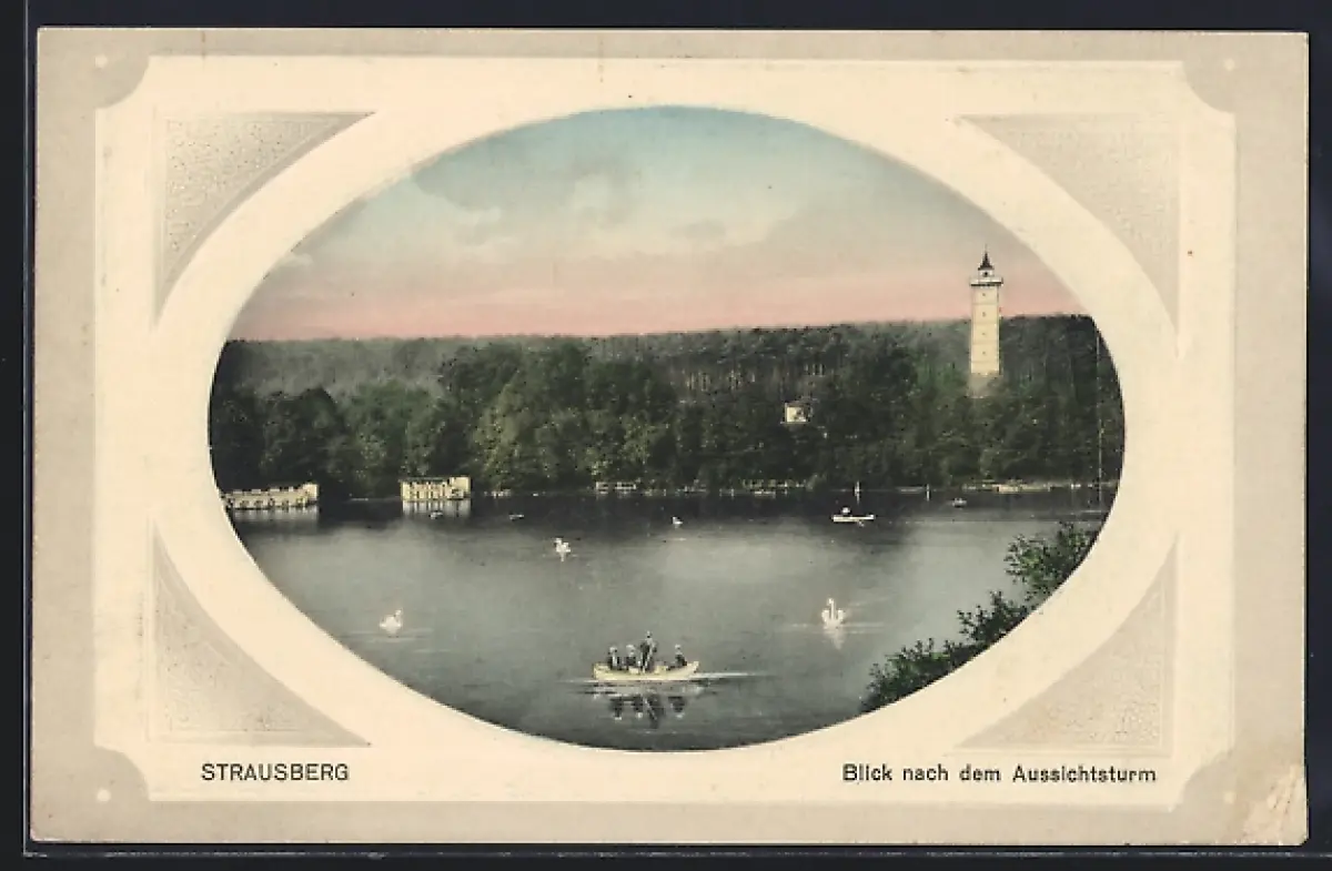 Präge-AK Strausberg, Wasserpartie mit Ausssichtsturm aus der Vogelschau, im Rahmen