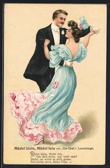 Präge-AK Tanzendes Paar in Abendgarderobe, Liedtext Mädel klein, Mädel fein