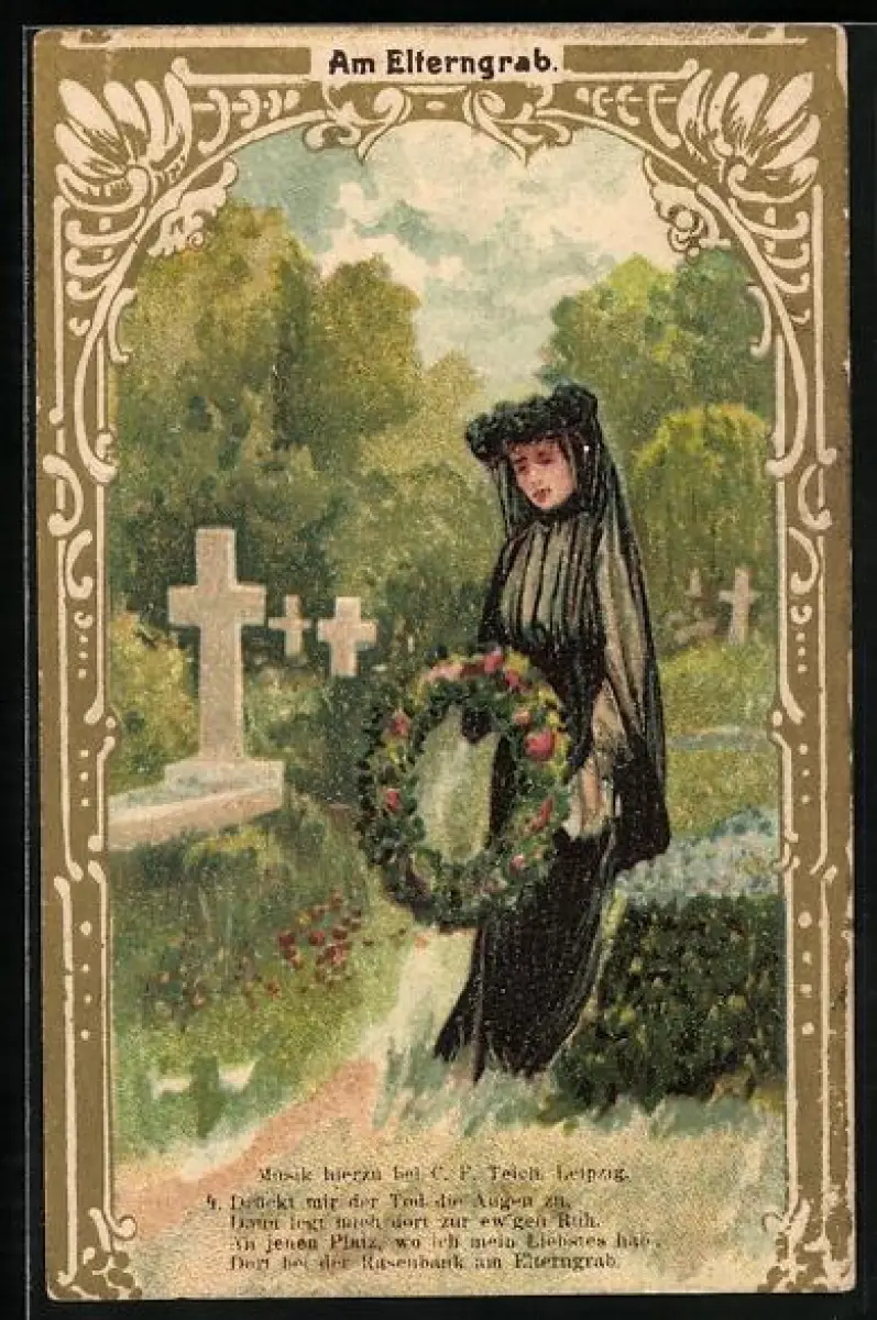 Präge-AK Trauernde Frau mit Kranz am Elterngrab