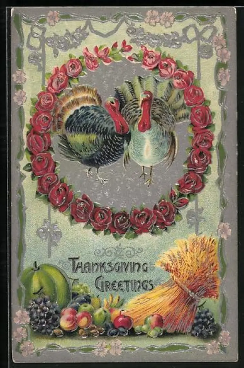 Präge-AK Truthahn-Paar in einem Kranz aus Rosen, Thanksgiving Greetings