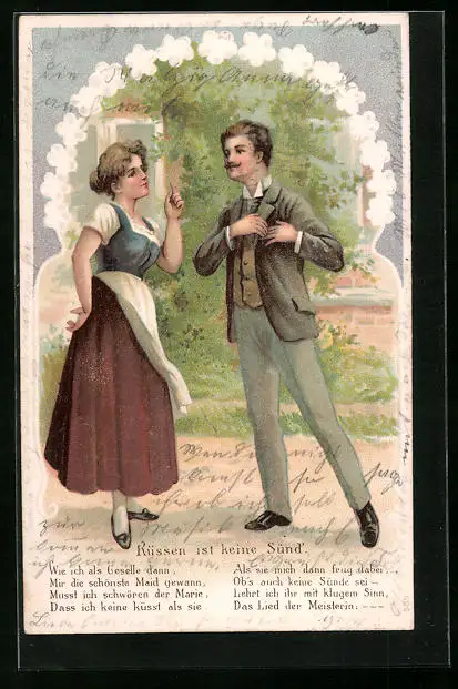 Präge-AK Verse: Küssen ist keine Sünd', Frau ermahnt Ihren Geliebten