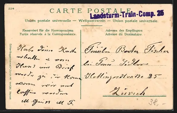 Personenbezogene Daten auf der Rückseite der Karte wurden durch blauen Textmarker unkenntlich gemacht. Die blauen Stellen sind auf die Vorderseite durchgeweicht und wirken sich negativ auf das Postkartenfoto aus