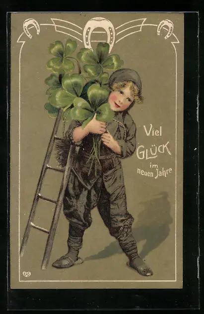 Präge-AK Viel Glück im neuen Jahre, Kleiner Schornsteinfeger mit Klee